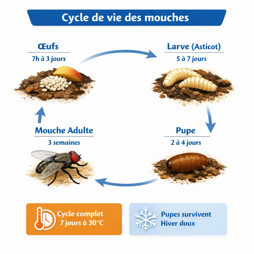 Le cycle de vie des mouches est caractérisé par une grande rapidité de développement et une forte capacité de reproduction, ce qui explique la vitesse à laquelle une infestation peut apparaître en milieu professionnel.